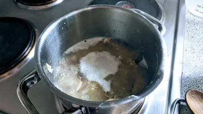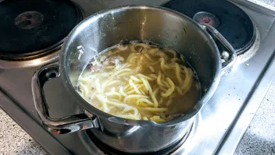 Sobald die Brühe kocht, das Miso gut einrühren, die Makrele dazu geben, mit Pfeffer würzen und die Nudeln dazu geben.